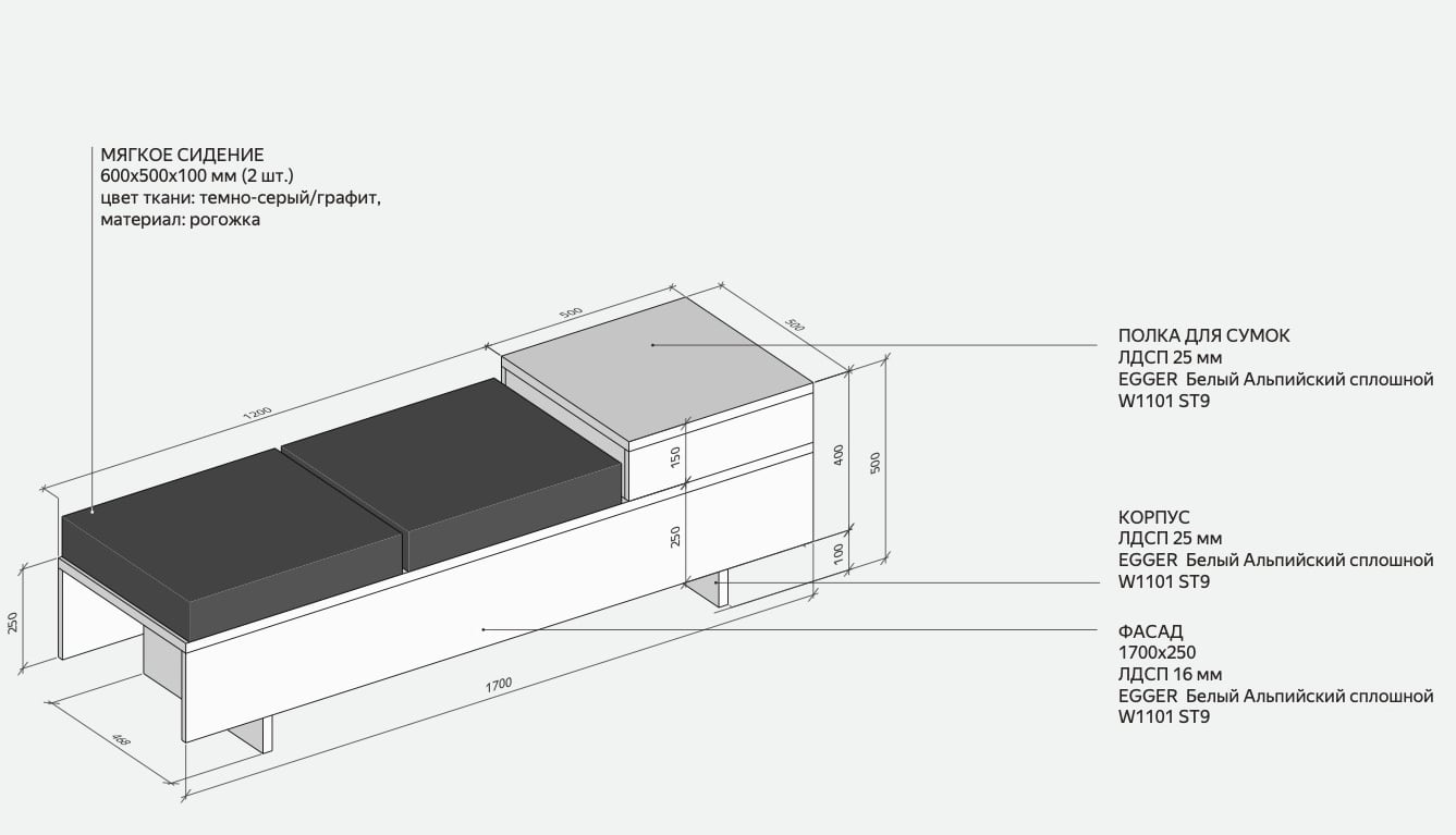Скамья 1700 × 500 × 500 мм